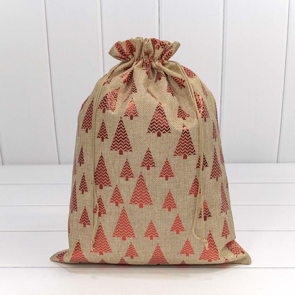 Краткое описание «Мешочки из искусственного льна 30*40 с рисунком Ёлки красный»