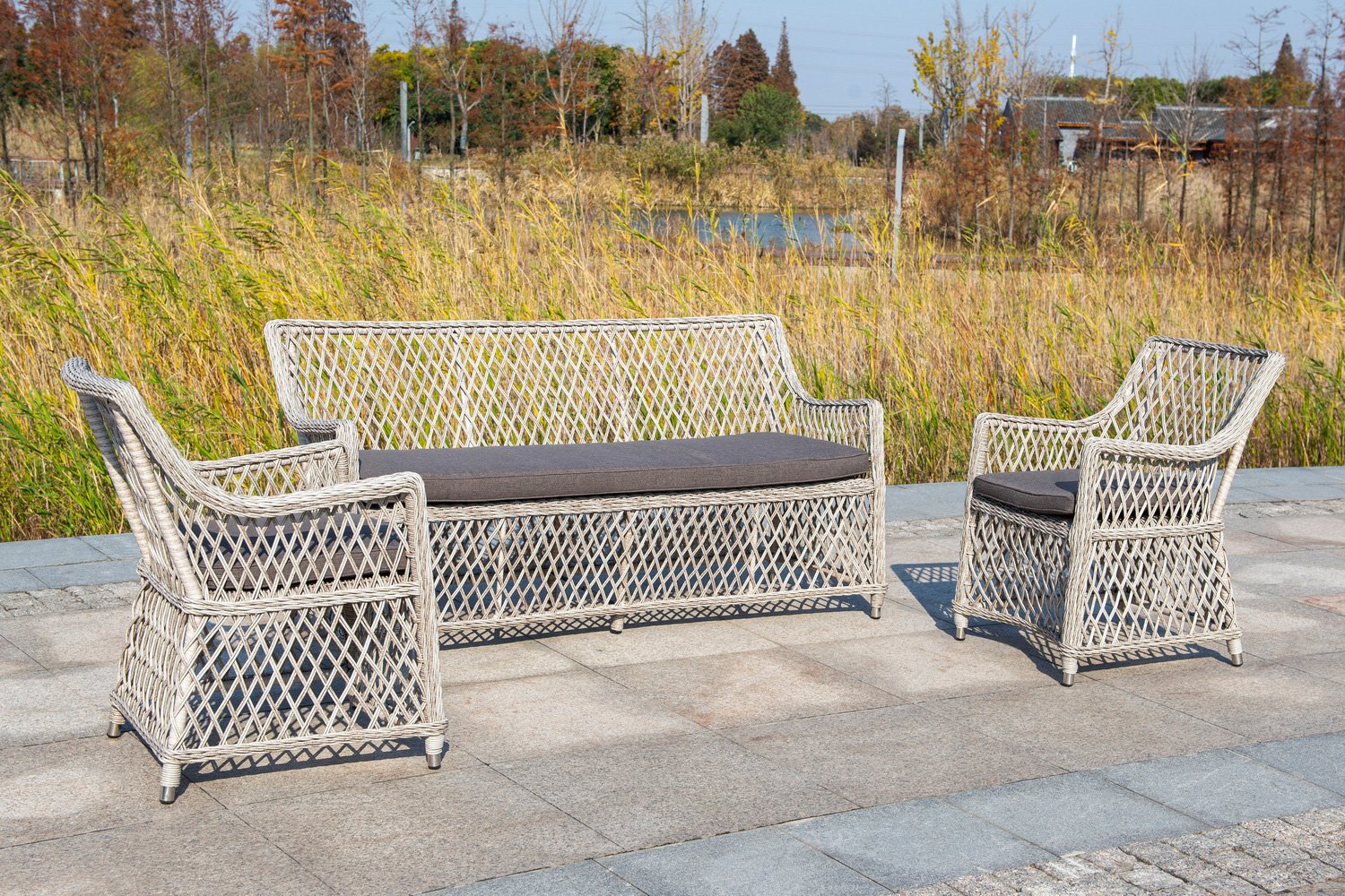 Диван имеет размеры 160х85х66 см, искусственный ротанг (оплетка) окрашена в серый цвет, глубина которого проявляется на солнечном свете.