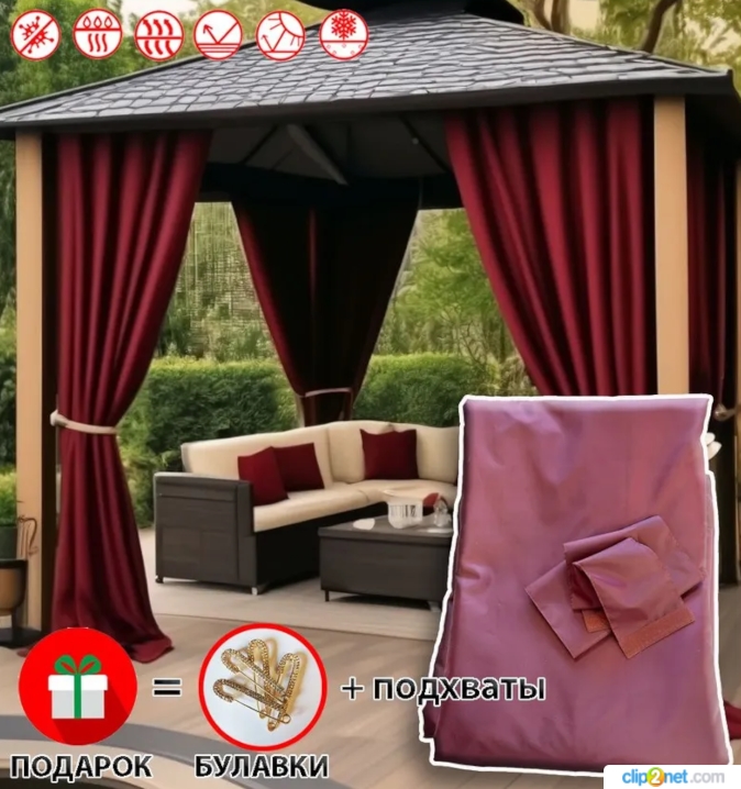 - В каждую штору вшиты двухсторонние молнии, чтобы беседку можно было закрыть как изнутри, так и снаружи. Это обеспечит возможность закрыться от внешних условий внутри беседки, или же, закрыть беседку на время, когда ей не будут пользоваться (конец дачного сезона);