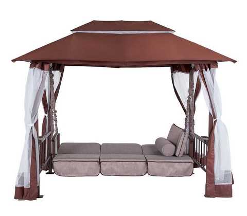 качелей может сильно трескаться и облазить, а металл в тот момент, когда он контактирует с водой, будет подвергаться воздействию коррозии. Кроме того, негативно повлиять на лакокрасочное покрытие могут и ультрафиолетовые лучи, в данном случае краска будет шелушиться и отпадать, а цвет не будет таким ярким. Кроме того, выгореть могут и мягкие элементы, они будут выглядеть не так привлекательно. Благодаря тенту, предназначенному для садовых качелей можно защитить качели от падающих веток и птичьего помёта, из-за чего летний отдых станет хуже. Качели, у которых есть тент, выглядят намного более привлекательно, что тоже является огромным преимуществом в пользу выбора тента. Также такой тент может продаваться вместе с противомоскитной сеткой, благодаря чему вы также будете защищены от насекомых, которые сильно могут омрачить летний отдых.