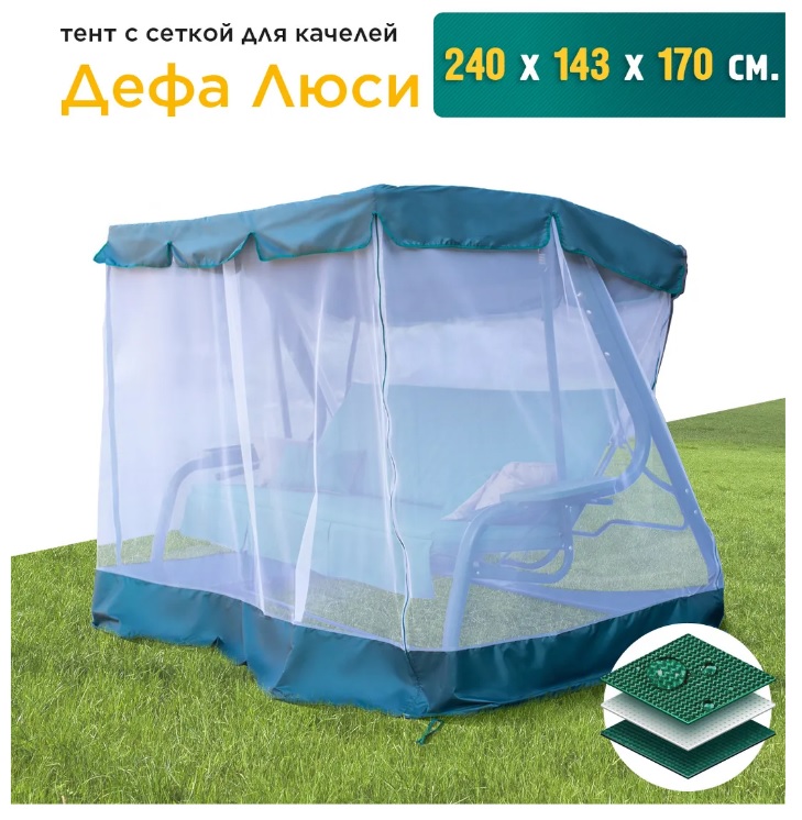 - Размер тента с сеткой для качелей Дефа Люси: 240х143х170 см. Обратите внимание размер считается по каркасу крыши качелей без свисающих элементов, а высоту корректно мерить, когда крыша находится в горизонтальном положении.